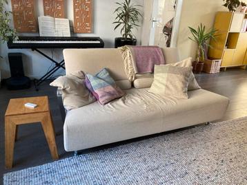 De bank is bekleed met een lichte stof en heeft een moderne uitstraling. Let op: de bank heeft een duidelijke beschadiging aan de zitting, zoals te zien op de foto's. Dus lijkt het je leuk om eraa