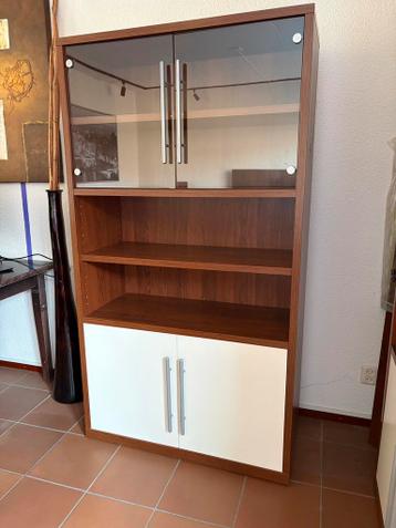 Beschadiging op zijkant, zie foto. Eventueel extra planken erbij. Deze kunnen op maat in de kast gemaak worden, of wellicht aan de muur opgehangen worden. Eventueel kleinere tweede kast beschikbaar (z