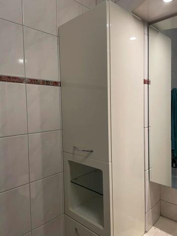 Complete badmeubelset gratis af te halen. De set bestaat uit een hoge kast met wasmand (35x32x180cm), een spiegelkast met twee deuren (70x15x90cm) incl. Bovenverlichting, een onderkast met twee deuren