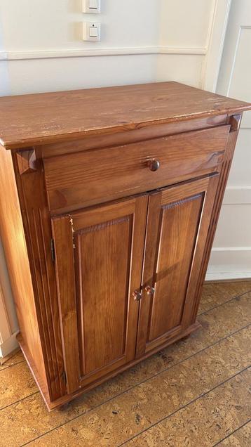 Gratis af te halen in leeuwarden: een charmant houten kastje met een lade en twee deurtjes. Het kastje is gebruikt en heeft wat slijtageplekken op het blad en aan de zijkant, zoals te zien op de foto&