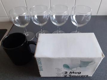 - set van 4 wijnglazen - een zwarte beker - 2 kopjes met schoteltjes (nieuw) in 1x gratis op te halen