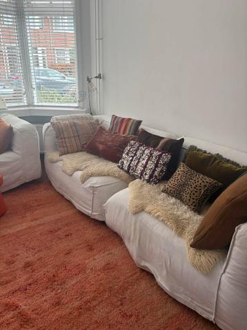 Mooie henk vos gelderlandbank, bestaande uit twee losse delen. De bank is bekleed met een witte stof en biedt comfortabele zitplaatsen. Ideaal voor een ruime woonkamer. De hoezen zijn wasbaar. Zo spoe