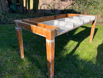 Kunnen we nog iemand hier een plezier mee doen? Klusproject helaas gestrand… zeer stevig tafel onderstel met opbergvakken. Wie geeft ‘m nog een tweede kans? 85 Cm breed 176 cm lang 75 cm hoog