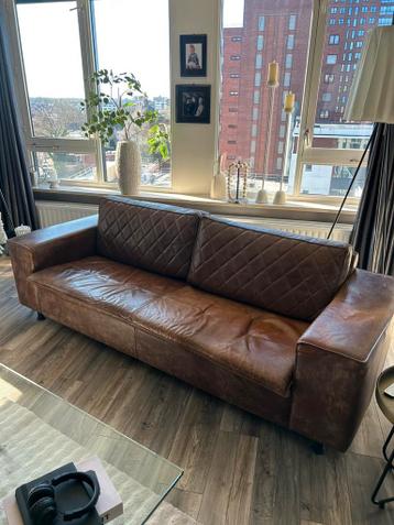 Bruine drie zit leren bank met kleine gebruikers sporen. Ophalen op zesde verdieping met de trap past niet in de lift.