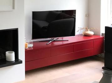 Tv meubel met 3 laden en kastje. Op 4 punten aan de muur te hangen. Openslaande klep onder is verwijderd; nu 3 open vakken. 220 X 43 x 38 cm mdf
