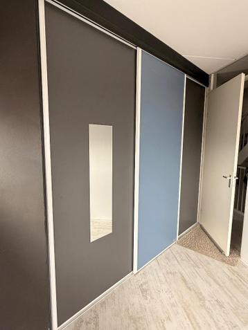 Staat klaar om opgehaald te worden. Voor de eerste die belangstelling heeft! Drie schuifdeuren voor het netjes wegwerken van een inbouwkast, inclusief frame. De deuren zijn 103 cm breed en 245 cm hoog