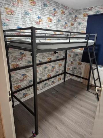 Deze stevige hoogslaper van zwart metaal is ideaal voor kleinere kamers, waardoor er extra ruimte onder het bed ontstaat voor een bureau, zithoek of opbergruimte. Het bed is in goede staat en biedt ee
