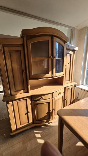 Gratis af te halen in haarlem: een set zware, robuuste houten meubels. De set bestaat uit een grote buffetkast met glazen deuren, een dressoir met spiegel en een eettafel met vier stoelen. De meubels