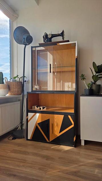 Unieke, beschilderde vitrinekast. De kast bestaat uit losse onderdelen en is voorzien van verlichting. Een echte eyecatcher voor in huis! De kast heeft een speels design door de beschildering en biedt