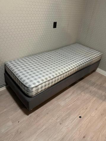 Een comfortabel eenpersoonsbed inclusief matras. Het bed heeft een stevige grijze stoffen bekleding en het matras heeft een fris wit-grijs geblokt patroon. Ideaal voor een logeerkamer of een kleine sl