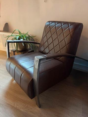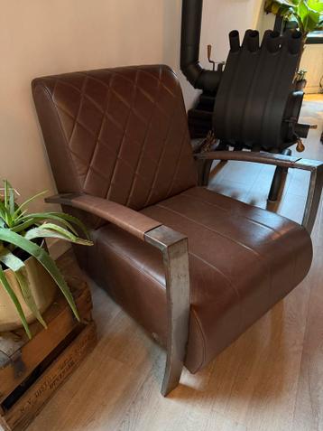 Mooie industriële fauteuil met een stevig metalen frame en comfortabele skai leren bekleding. De stoel heeft een uniek ruitpatroon op de rugleuning en zitting, wat zorgt voor een stijlvolle uitstralin