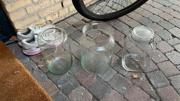 Drie glazen vazen en een weckpot, ideaal voor decoratie, opslag of als bloemenvaas. Ze zijn gebruikt, maar in goede staat. Gratis af te halen.