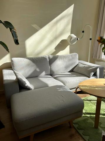 Lichtgrijze bank in mid century stijl (195 x 85 cm) met hocker (85 x 60 cm). In gebruikte staat met een paar vlekken maar redelijke kans dat die er nog uit gaan. Zit verder nog goed, moet weg omdat ik