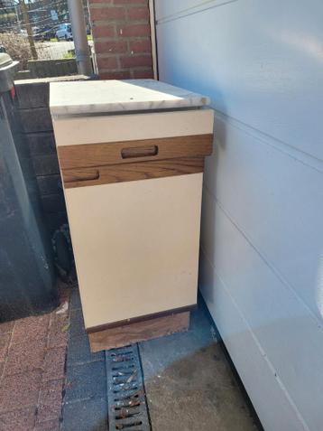 Gratis af te halen: een klein, stevig kastje. Ideaal voor extra opbergruimte in de schuur, garage of als bijzettafeltje. Het kastje heeft een crèmekleurige afwerking met een houten accent en een marme