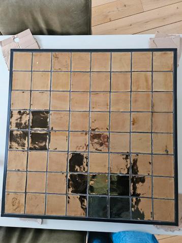 Uniek tafelblad van 85 bij 85 cm, ingelegd met prachtige gouden tegeltjes. Dit blad is perfect om een eigen onderstel onder te plaatsen of te gebruiken als decoratief element. Zonder poten, dus u kunt