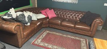 Gratis af te halen: comfortabele bruine hoekbank. De bank heeft een klassieke uitstraling met knopen in de rugleuning. Er zijn duidelijke gebruikssporen aanwezig, met name slijtageplekken op de zittin