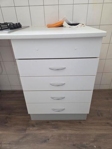 Keukenkastje met lades hoogte: 76 cm. Breedte: 59,5 cm. Diepte: 56,5 cm. Het aanrechtblad zit er op vast gemaakt, dus geen mooie bovenkant. Lades zijn nog prima. Alle 4 inclusief bestekbak. Ophalen in