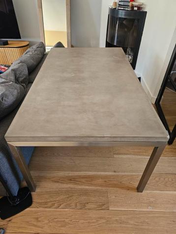 Breedte 106.5Cm lengte 182.5Cm hoogte 78cm hoogte onderkant tafelblad 68cm de tafel is 5cm massief beton en een 5cm breed rvs onderstel. Unieke tafel, gekocht in boston. In verband met samenwonen doen