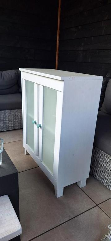 Te koop: een wit kastje in uitstekende staat. Dit veelzijdige meubelstuk is voorzien van twee deurtjes met melkglas, wat zorgt voor een stijlvolle en discrete opbergruimte. De groene deurknopjes voege