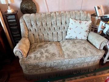 Klassieke bank met twee bijpassende stoelen. De bank is 1,42 meter breed, met een zitgedeelte van 1,16 meter breed en 57 cm diep. De zithoogte is 42 cm en de totale hoogte is 85 cm. De stoelen zijn 83