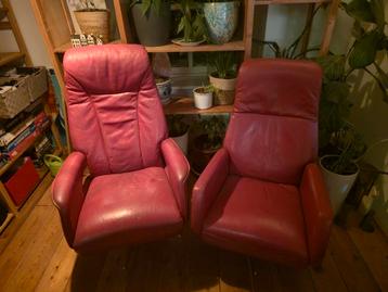 Twee comfortabele, gebruikte rode lederen relaxfauteuils. Ze zijn gebruikt, maar nog in goede staat voor een volgende ronde. Ideaal om heerlijk in te ontspannen!