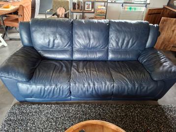 Donker blauwe lederen 3 zits bank en een donker blauwe 2 zits bank met rechts een relax stand , beide goed onderhouden. Maar overbodig . Gratis ophalen