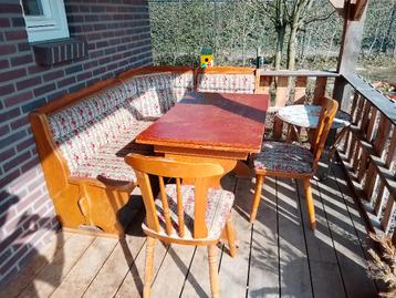 Leuke hoekbank en eetset te koop. Buiten afmetingen hoekbank: 170 bij 130 is van gelamineerd meubelhout gemaakt.
