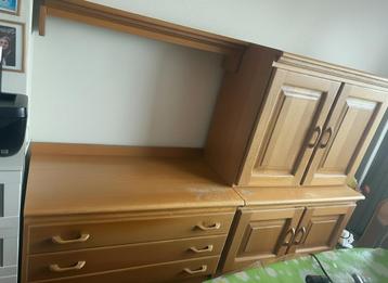 Dit veelzijdige wandmeubel biedt een combinatie van lades en kasten, ideaal voor het opbergen van diverse spullen. Het meubel is gemaakt van een lichte houtsoort en past goed in verschillende interieu