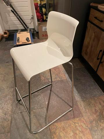 Twee super goed onderhouden witte krukken. Ideaal voor aan een bar of hoge tafel. De zithoogte is 75 cm, de totale hoogte inclusief rugleuning is 100 cm en de zitdiepte is 37 cm. Ze zijn gemaakt van k