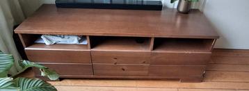 Donkerbruin tv-meubel met 2 handige lades en 1 klep in het midden. Ideaal voor het opbergen van diverse spullen. Het meubel heeft een lengte van 150 cm, een hoogte van 53 cm en een diepte van 50 cm. E