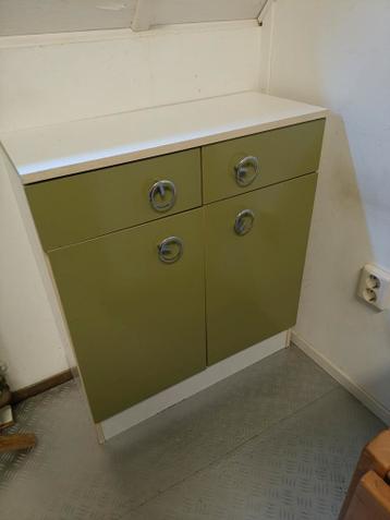 Leuk groen kastje met twee lades en twee deurtjes. Het kastje heeft wat liefde en aandacht nodig, maar kan met een opknapbeurt weer een mooie toevoeging zijn aan elk interieur. Gratis op te halen! 30