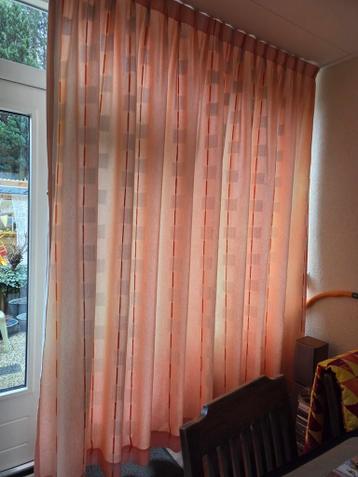 Set van twee oranje gordijnen, samen circa 355 cm breed en 250 cm hoog. De gordijnen zijn eenvoudig te reinigen, aangezien ze in de wasmachine gewassen kunnen worden. Ze zijn gebruikt, maar nog in goe