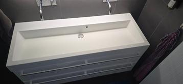 Complete badkamermeubelset bestaande uit een lange kast met wastafel en een hoge kast. De plaklaag laat bij de lange kast en wastafel op sommige plekken los. Bij de hoge kast is een klein stukje van d