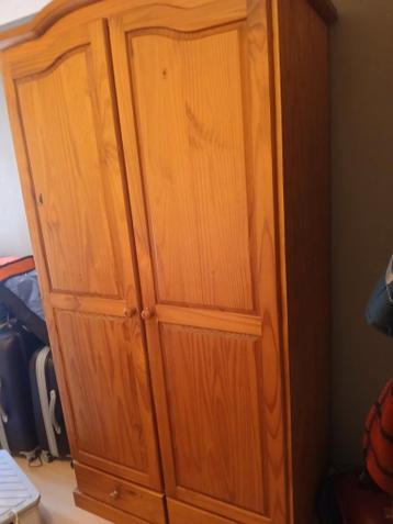 Gratis op te halen mooie, gebruikte houten kledingkast met twee deuren. De kast heeft aan de rechterkant vier legplanken en een lade, en aan de linkerkant een hangruimte met een lade. Ideaal voor het