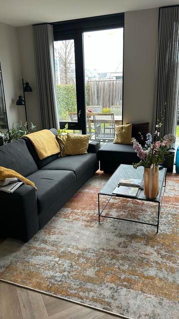 Grijze bank 2,5 zits + hocker comfortabele 2,5 zits bank met bijpassende hocker. De bank is in prima staat en heeft een grijze stoffen bekleding. Ideaal voor een kleine woonkamer of appartement. De ho