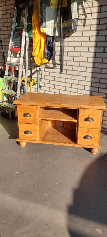 Houten tv kastje. Breed 95 cm, diep 45 cm, hoog 55 cm. Ruimte tussen de laadjes 40 cm.