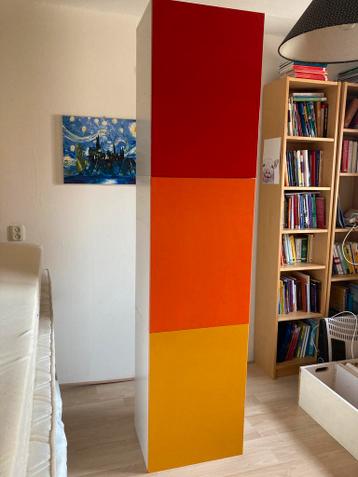 We zijn een oude kinderkamer aan het opruimen. Hierin hadden we drie ikea-keukenkastjes hangen met drie vrolijk gekleurde deurtjes. Op de foto staan de drie kastjes bovenop elkaar. Kastjes zijn 70 cm