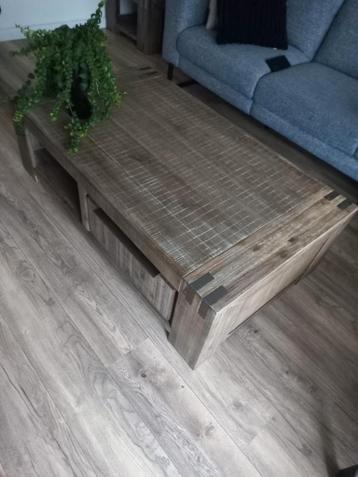 Salontafel 140x80x42 met 2 lades van 54 cm breed. Eettafel 190x95x78. Plus 4 stoelen met wieltjes. Eventueel ook met 2 vierkante bijzettafels.