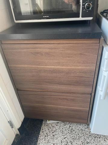 Incl. Een paneel links en rechts. Walnootpatroon. Er zitten twee grote lades in. Bij de onderste lade zit nog een binnenlade middel en bij de bovenste lade zitten nog twee binnenlades laag (gebruikt a