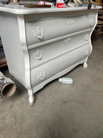 Prachtige antieke ladekast in een lichte kleur, ideaal voor een klassiek of brocante interieur. De kast heeft drie ruime laden met sierlijke, gedetailleerde handgrepen en staat op elegante poten. Perf