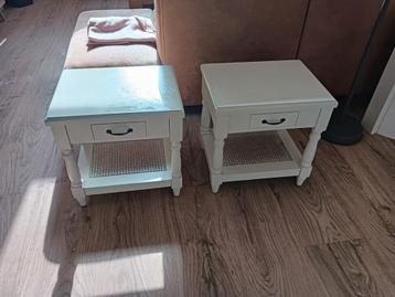 Twee gebruikte bijzettafels of nachtkastjes die wat liefde en aandacht kunnen gebruiken. Ze zijn nog functioneel, maar hebben duidelijke gebruikssporen en kunnen een opknapbeurt gebruiken om er weer a
