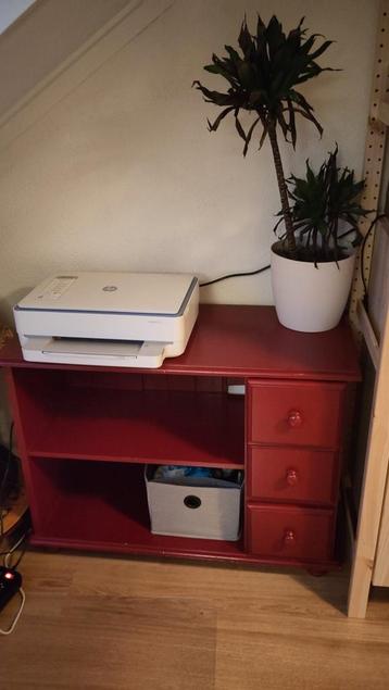 Rood kastje met handige lades en een open vak. Rechtsachter is een opening voor kabels / mist een klein stukje van de plank. Gratis af te halen.