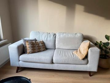 Fijne, grijze bank van het merk umix. Mooie, donkere houten pootjes. Kussens kunnen eruit worden gehaald daardoor niet heel zwaar om te vervoeren. Enkele vlekken in de stof, wellicht met vlekverwijder