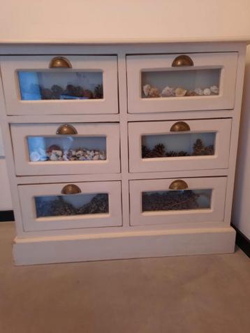Ladekast in landelijke stijl. De kast heeft zes laden met glazen fronten. De kast is wit geverfd en verkeert in goede staat. Een echte blikvanger voor elk interieur.