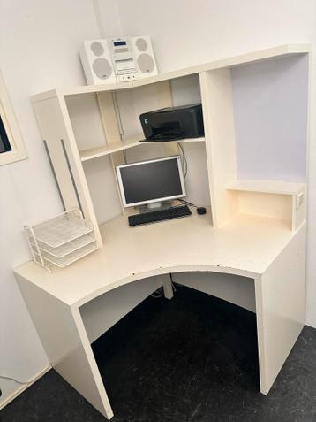 Praktisch hoekbureau in crème kleur, ideaal voor een thuiskantoor of studeerkamer. Het bureau heeft een geïntegreerde opbouw met meerdere planken en vakken voor het opbergen van boeken, documenten en