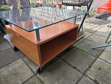 80 bij 80 cm. Op wielen. Glazen plaat moet nog vastgezet worden. Schroeven aanwezig.