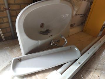 witte wastafel (met ophangbeugel en rozetje) en bijbehorend planchet uit 1972. De kraan is inmiddels verwijderd (was lek).