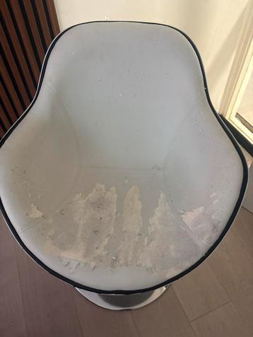 Aangeboden: een witte draaibare stoel met een chromen voet. Het zitvlak van de stoel is beschadigd, zoals te zien is op de foto's, met afbladderend materiaal. De stoel draait soepel en de voet is