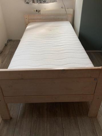 Een 1 persoonsledikant, in een white wash look. Het bed is eerst gebruikt als halfhoog slaper en later als ledikant. Het heeft door het gebruik en zonlicht gebruikerssporen maar met een mooie beits is