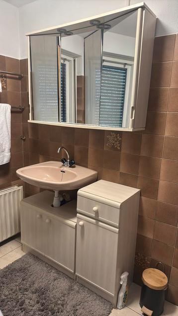 Complete badkamerset, gebruikt maar nog in goede staat voor een volgende ronde. De set bestaat uit een wastafelmeubel, een spiegelkast en een extra kleine kast. Let op: de inhoud van het wastafelmeube